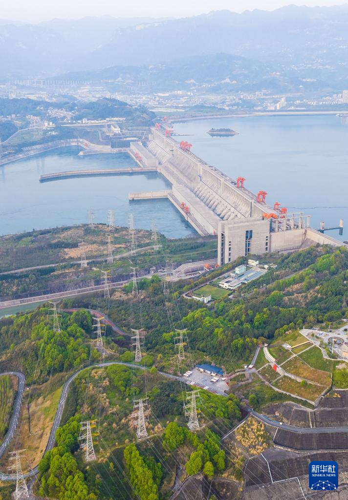 这是4月2日在湖北宜昌拍摄的三峡大坝及外送输电线路(无人机照片)。