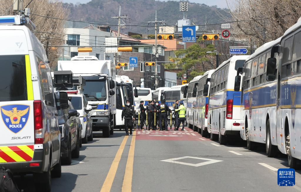 4月3日,在韩国首尔,警察在宪法法院周边布置大量警察车辆执勤。