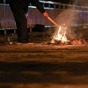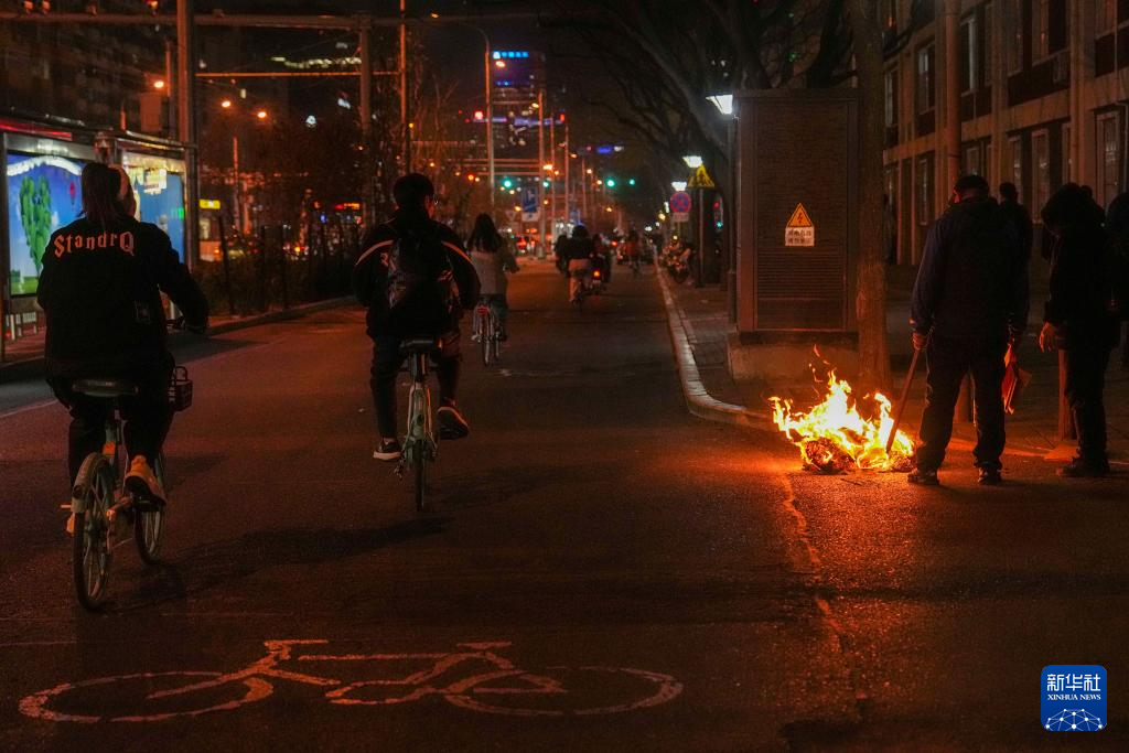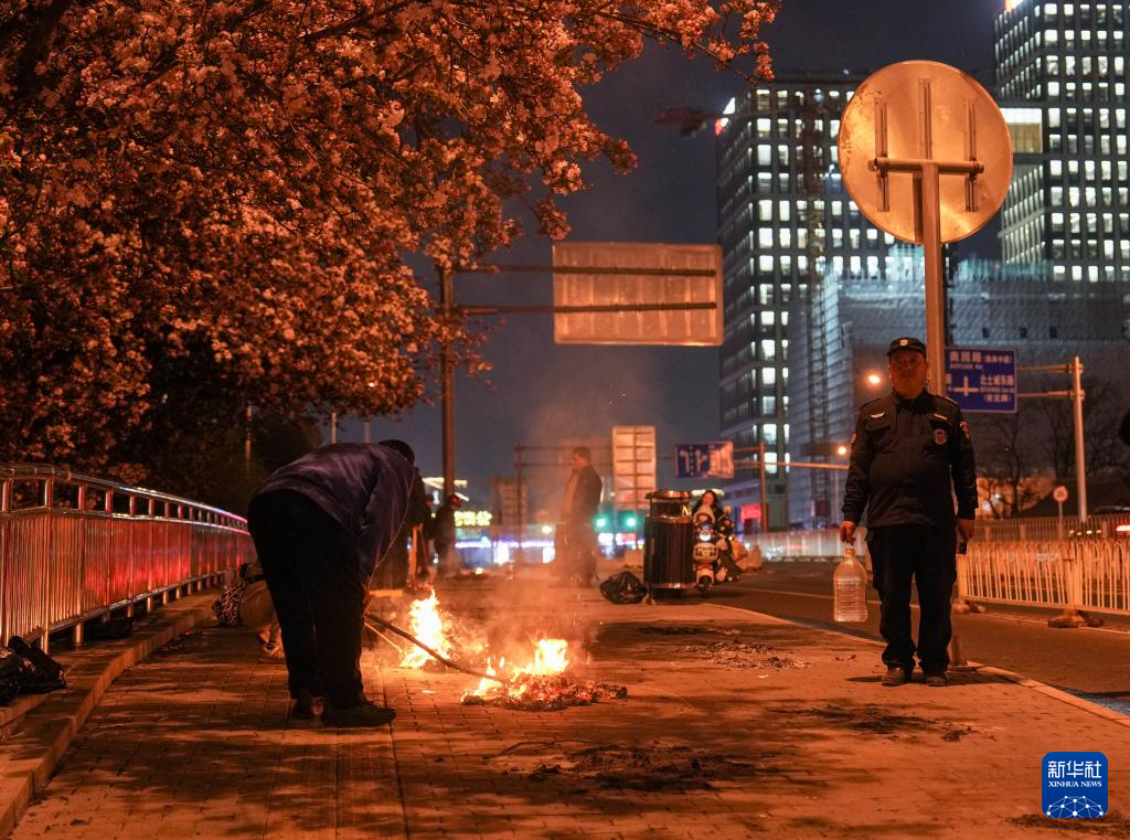 4月2日,在北京街头某处,焚烧纸钱的火星随风飘扬。