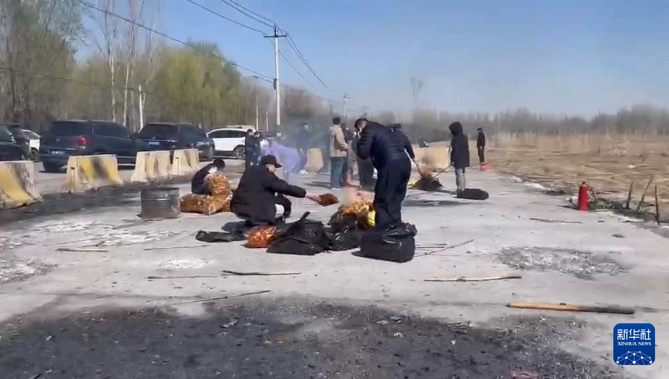 3月30日,市民在北京郊区一处公墓入口处的路边焚烧纸钱,公安、消防人员在一旁值守(视频截图)。