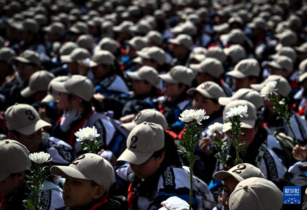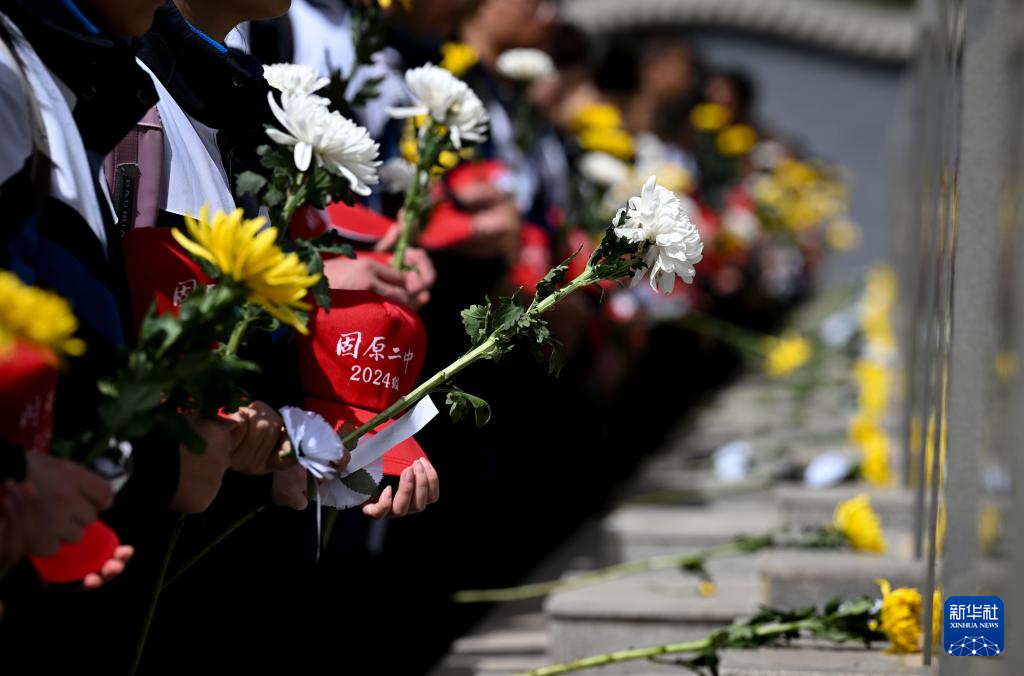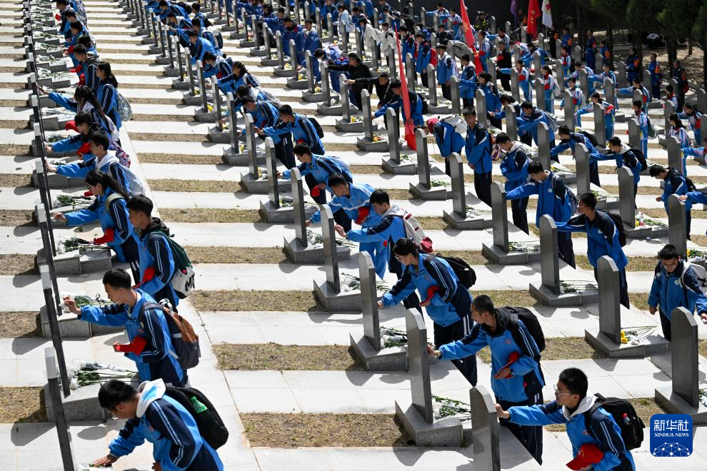 4月3日,在任山河烈士陵园,固原二中学生向烈士墓碑献花。