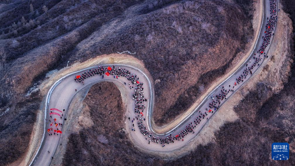 4月3日,参加徒步祭英烈活动的师生在翻越黄峁山(无人机照片)。