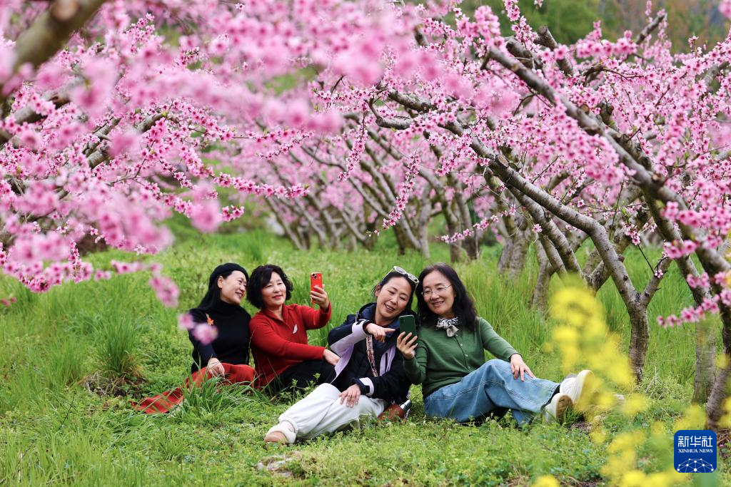 4月1日,游客在重庆市黔江区濯水镇乌杨社区黄桃基地赏花游玩。