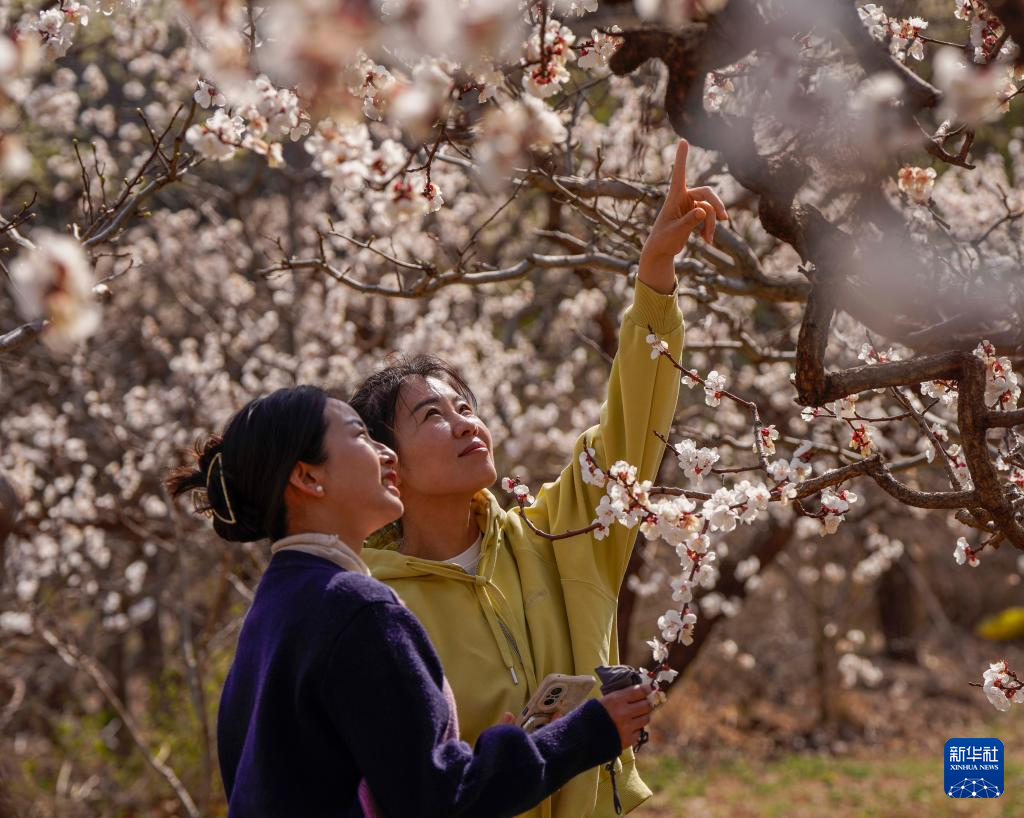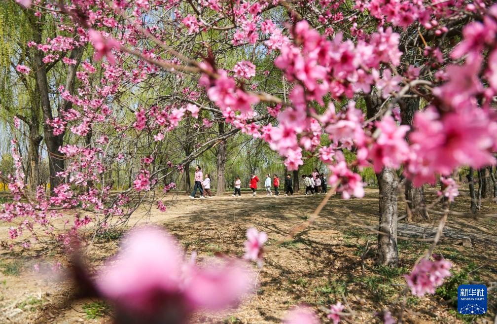 4月3日,游客在河北省遵化市南山常乐谷景区赏花游玩。