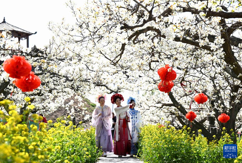4月2日,游客在河北省石家庄市赵县谢庄镇梨果生产基地观光拍照。
