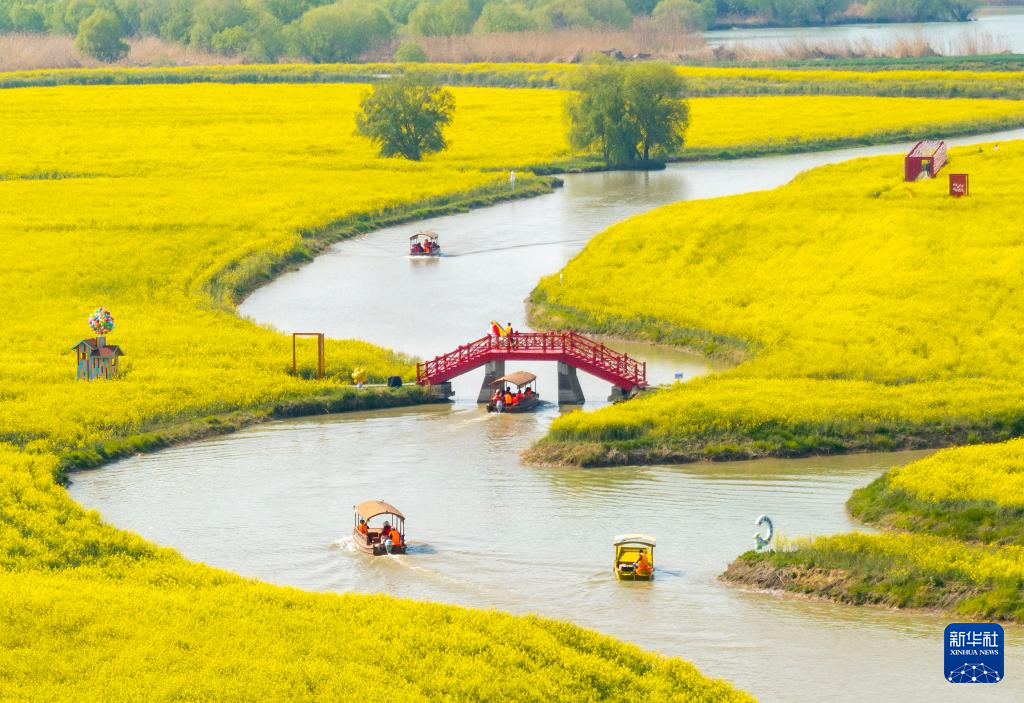 4月3日,游客在江苏省高邮市湖上花海景区赏花游玩(无人机照片)。