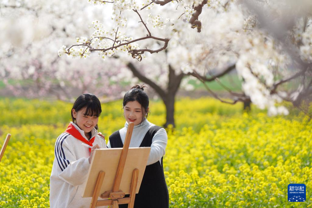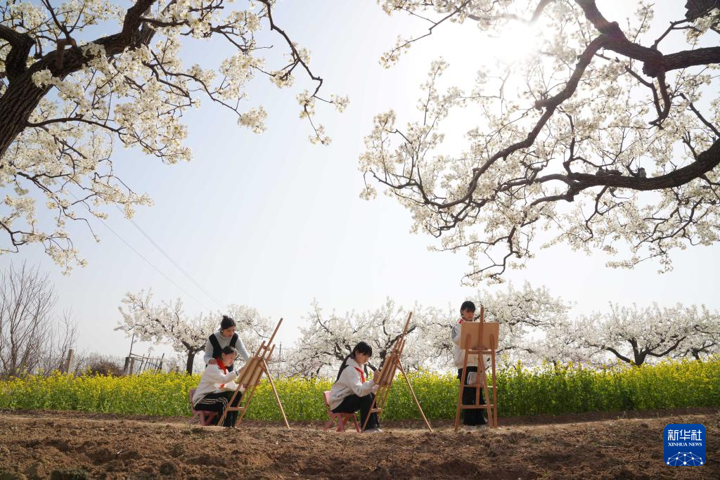 4月3日,河北省邢台市内丘县大都城小学学生在果园写生。