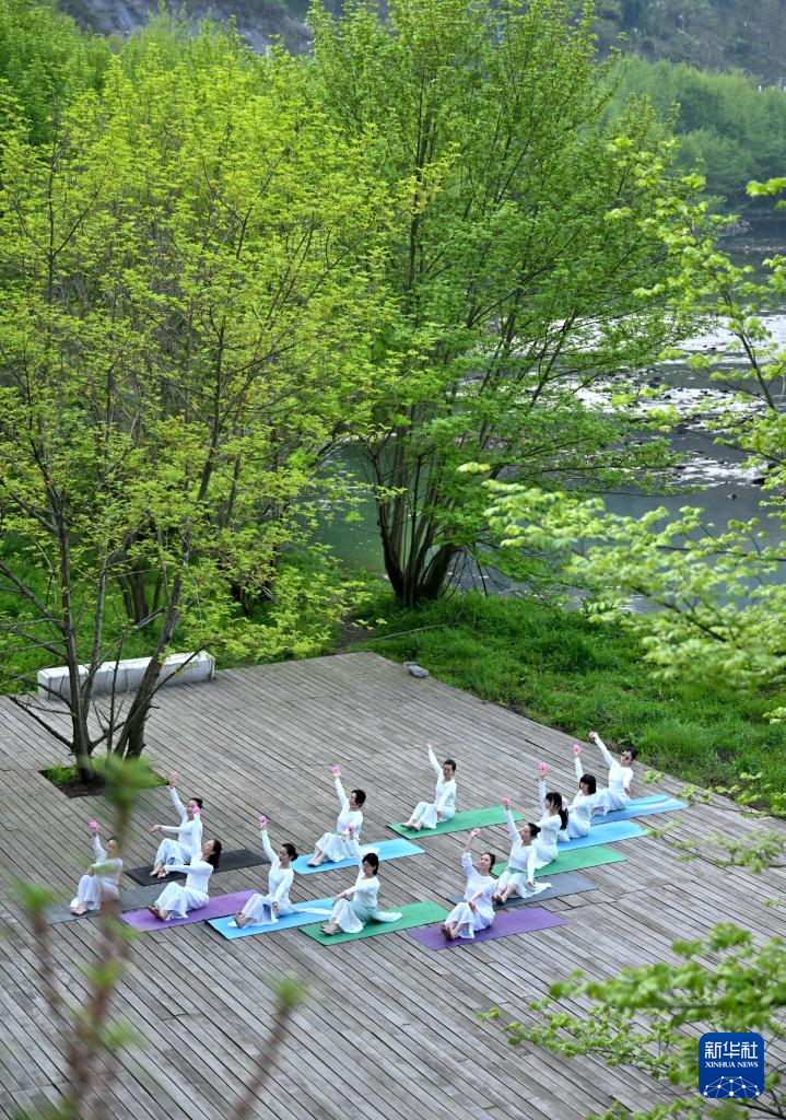 4月3日,市民在湖北省宣恩县城贡水河畔晨练。