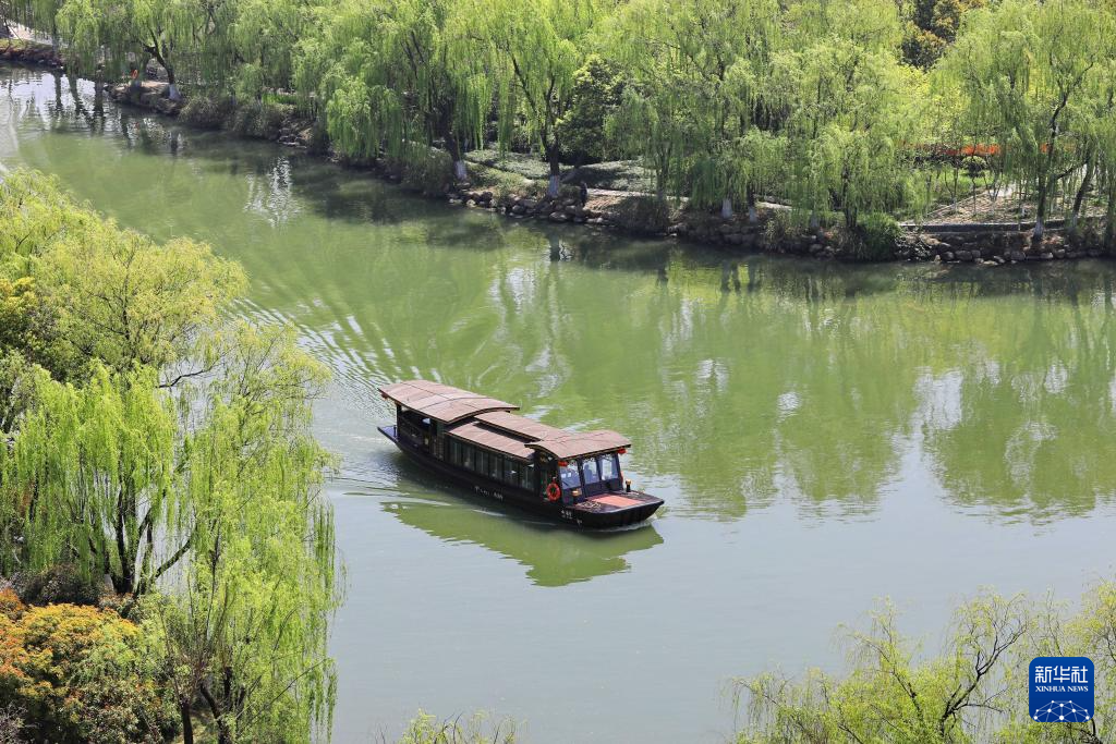 4月3日,游船从浙江省嘉兴市南湖风景区湖面驶过。