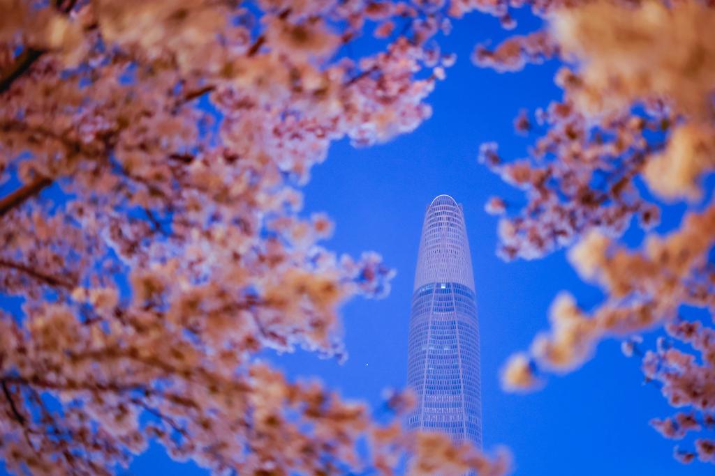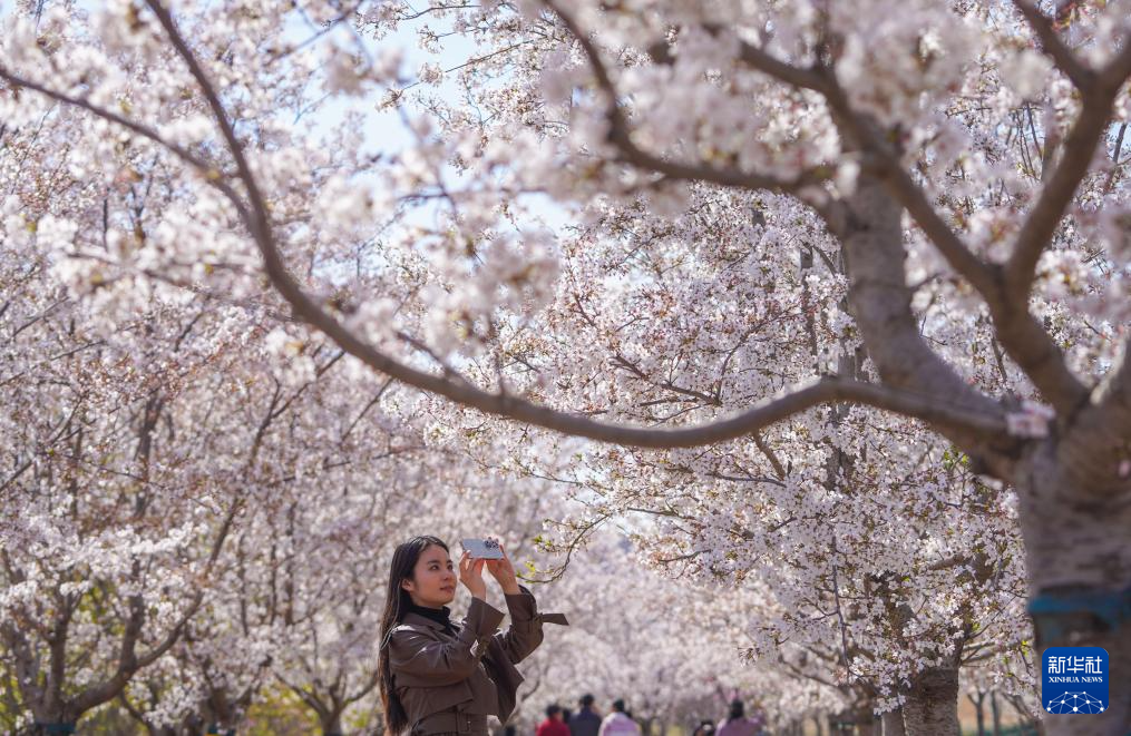 4月3日,市民在天津市滨海新区泰达城市广场拍摄樱花。