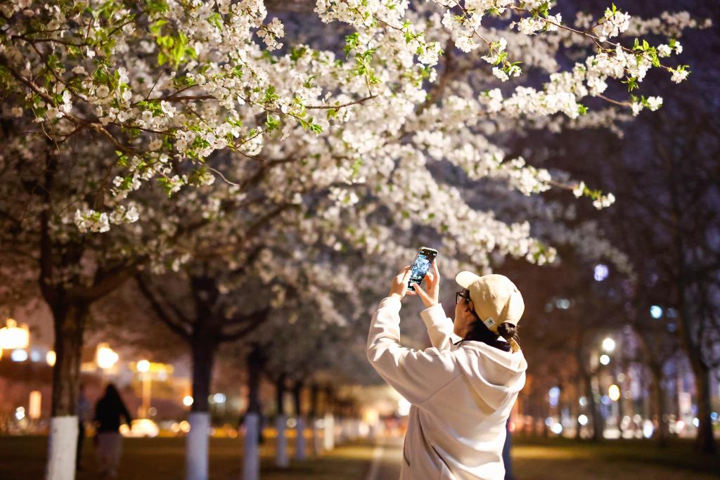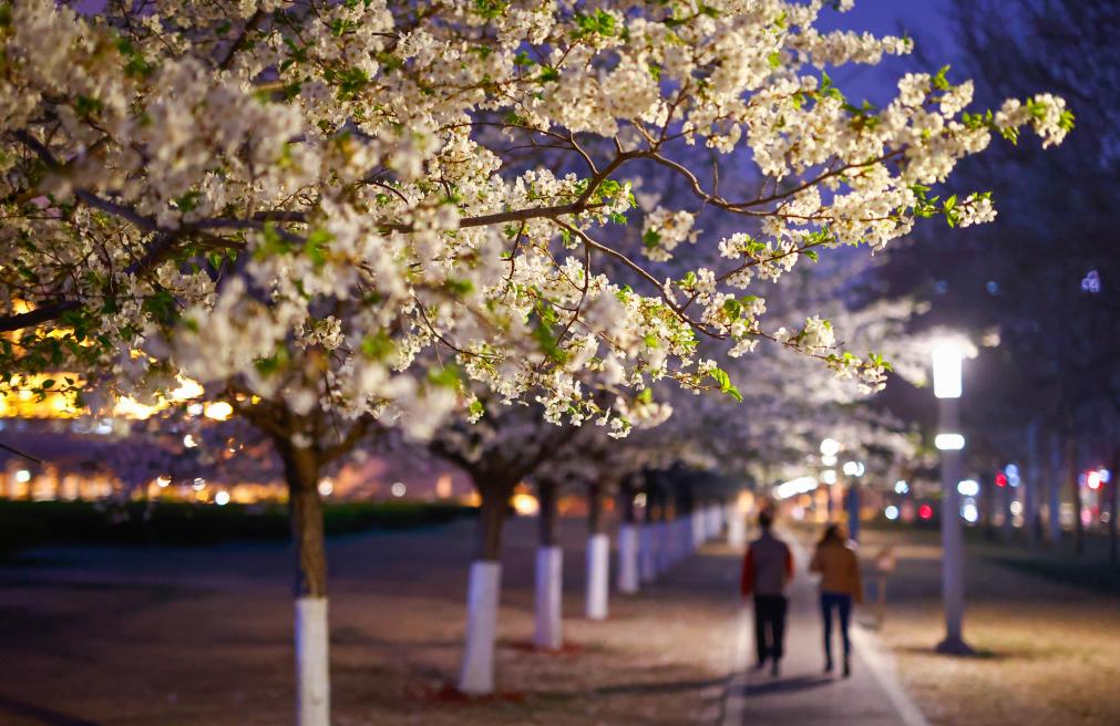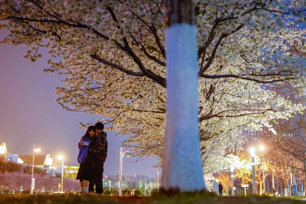 4月3日,市民在天津市滨海新区泰达城市广场夜赏樱花。