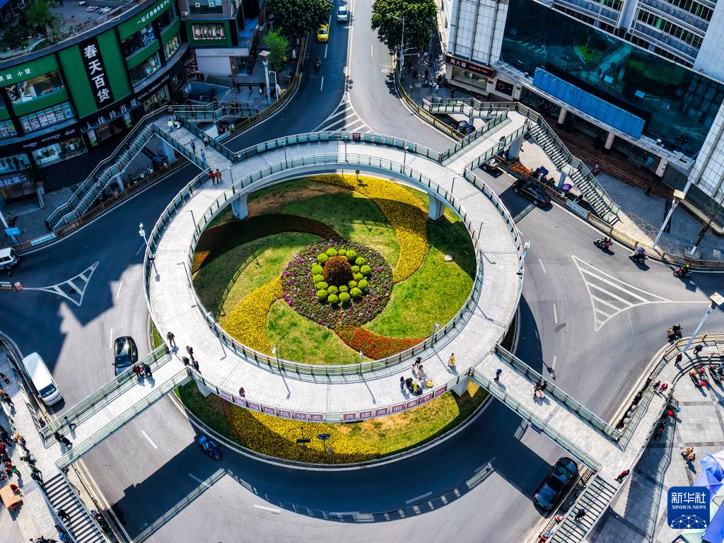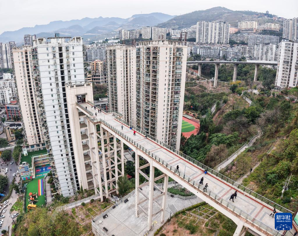 人们行走在重庆奉节一处人行天桥上(2025年2月12日摄,无人机照片)。