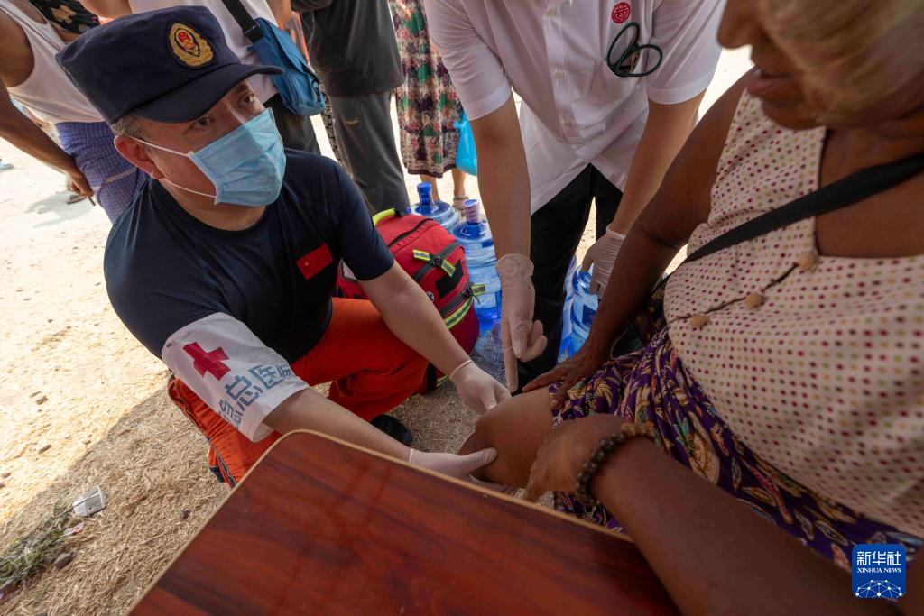 4月3日,在缅甸曼德勒医学院附近的一处安置点,中国救援队队员为一女子检查关节损伤情况。