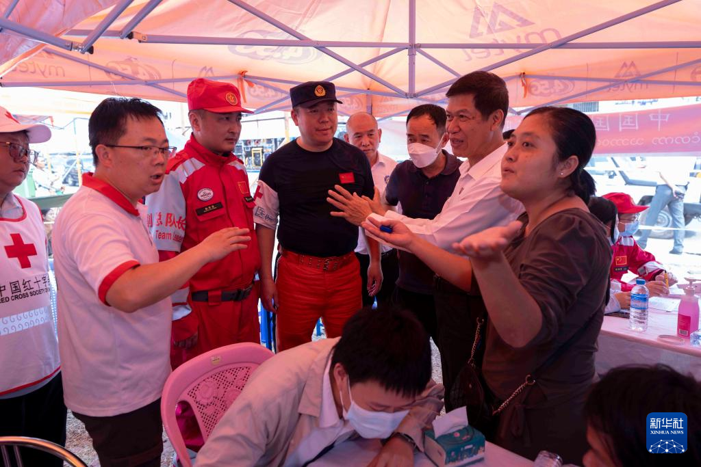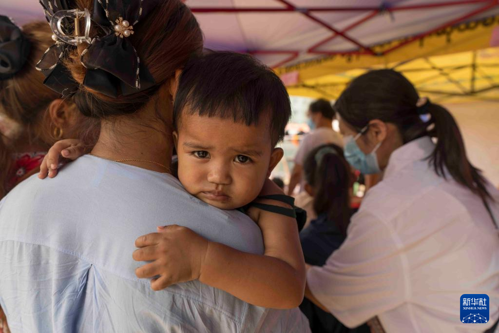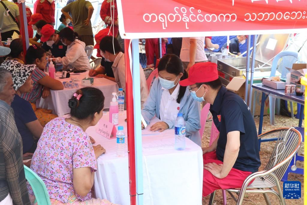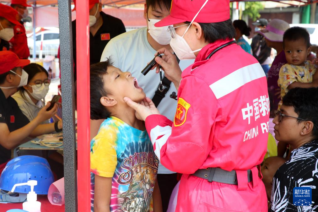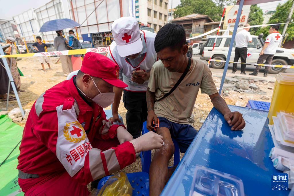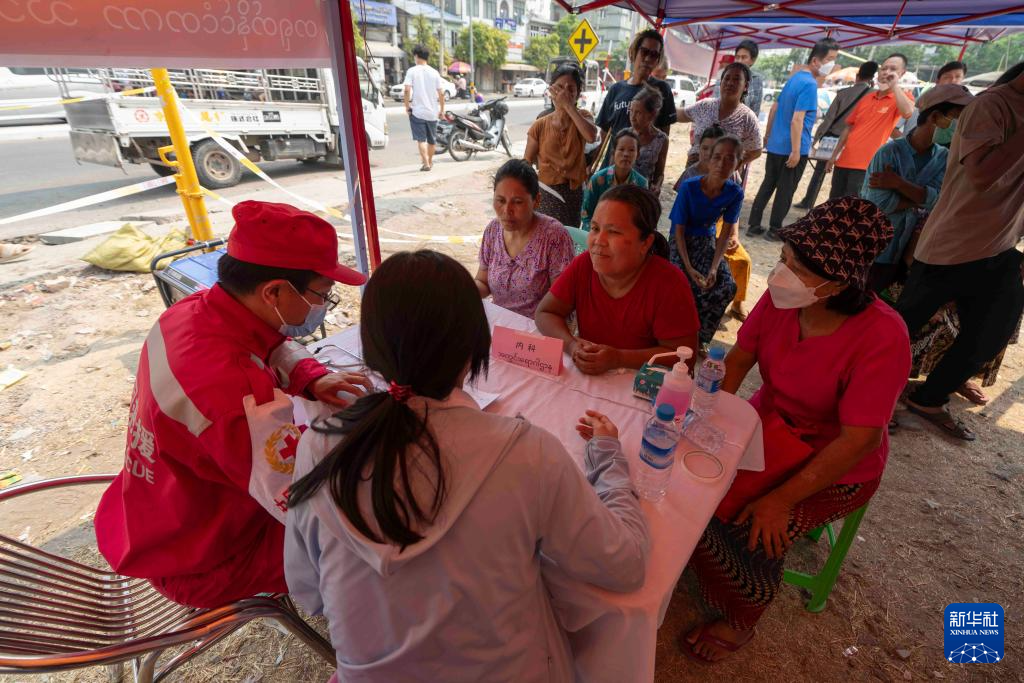 当日,在缅甸曼德勒医学院附近的一处安置点,中国救援队伍开展义诊,为该安置点的千余名灾民提供诊疗服务。