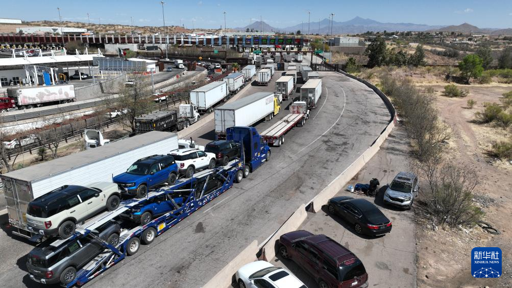 4月2日,在墨西哥索诺拉州诺加莱斯市,一辆装载多辆汽车的运输车(下中)行驶在墨美边境附近的公路上(无人机拍摄)。