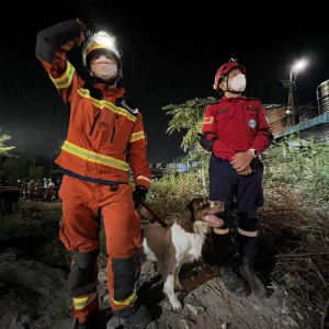 4月2日,中国香港特区救援队队员(左)和深圳公益救援队队员在缅甸曼德勒开展救援。