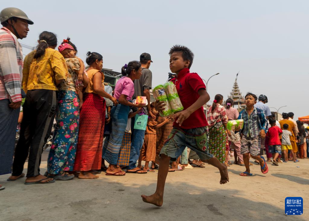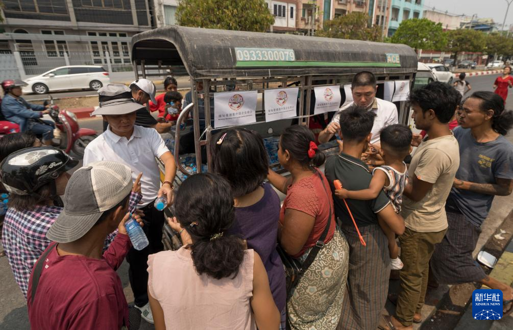 4月4日,在缅甸曼德勒皇宫附近的一处安置点,缅甸曼德勒中国企业商会的工作人员分发饮用水。