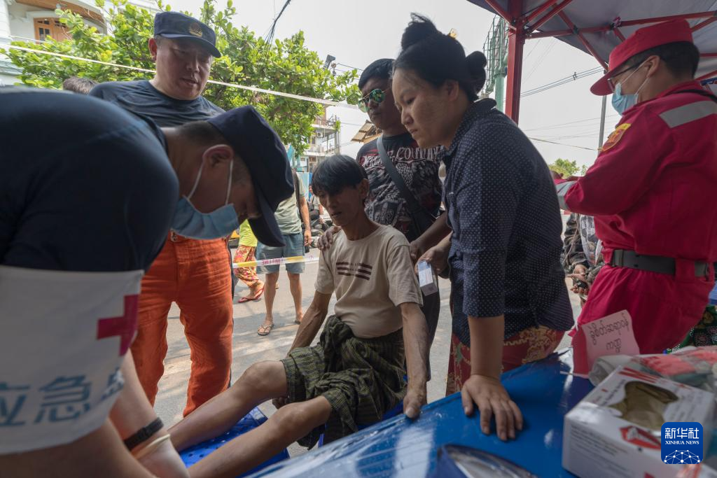 4月4日,在缅甸曼德勒皇宫附近的一处安置点,中国救援队队员为一名男子检查伤情。
