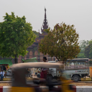 4月4日,在缅甸曼德勒皇宫附近的一处安置点,一名女子穿行马路。