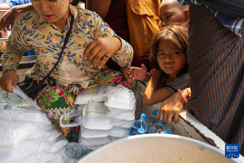 4月4日,在缅甸曼德勒皇宫附近的一处安置点,一名儿童领取食物和饮用水。