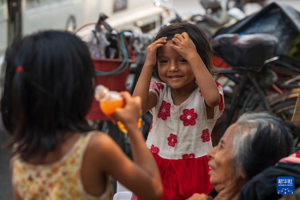 4月4日,在缅甸曼德勒皇宫附近的一处安置点,一名儿童领取食物。