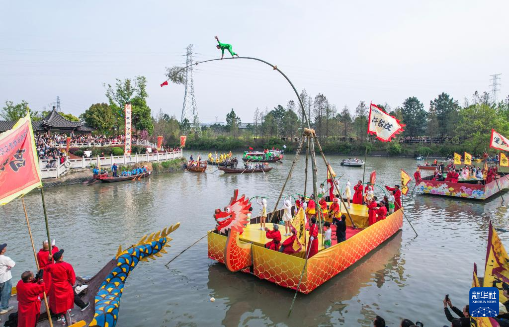 这是洲泉镇2025春季“双庙渚蚕花水会”上举行的水上高杆船技展演(4月4日摄)。