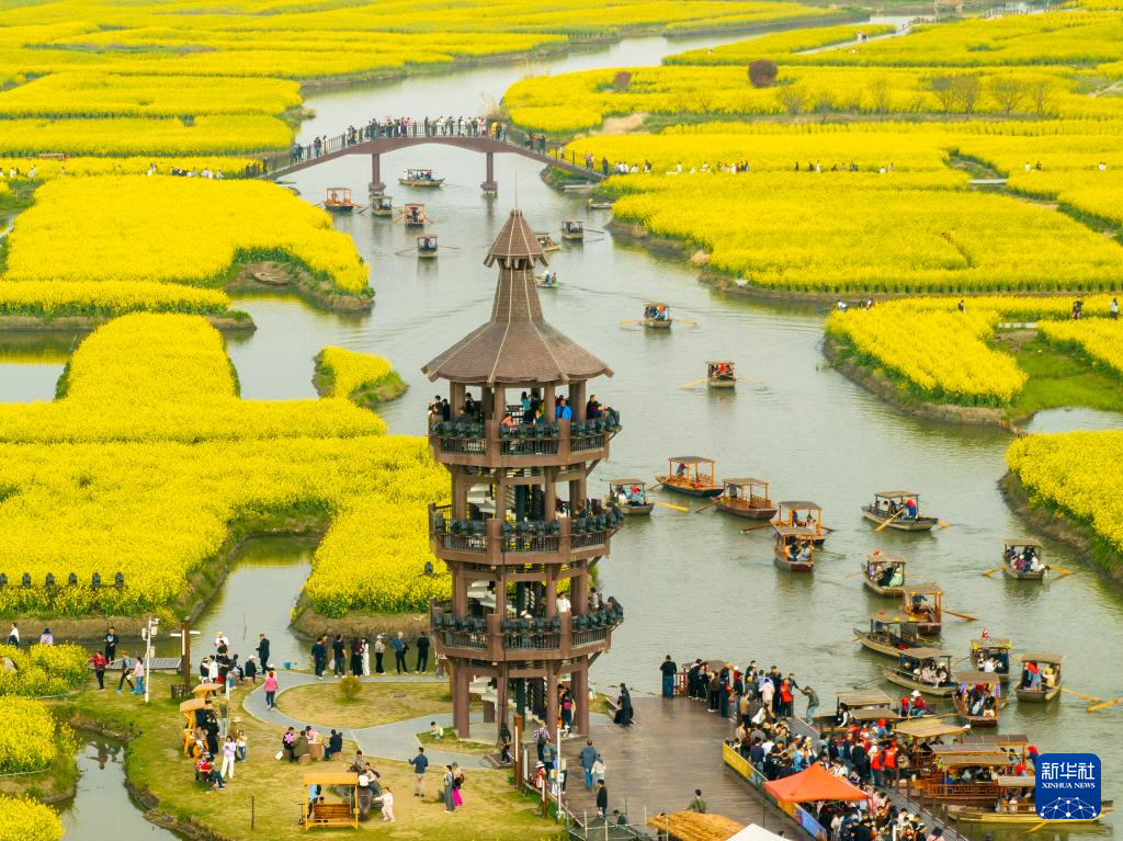4月5日,游客在江苏省兴化市千垛景区赏花游玩(无人机照片)。