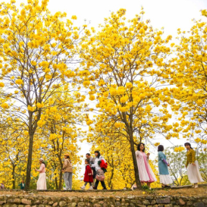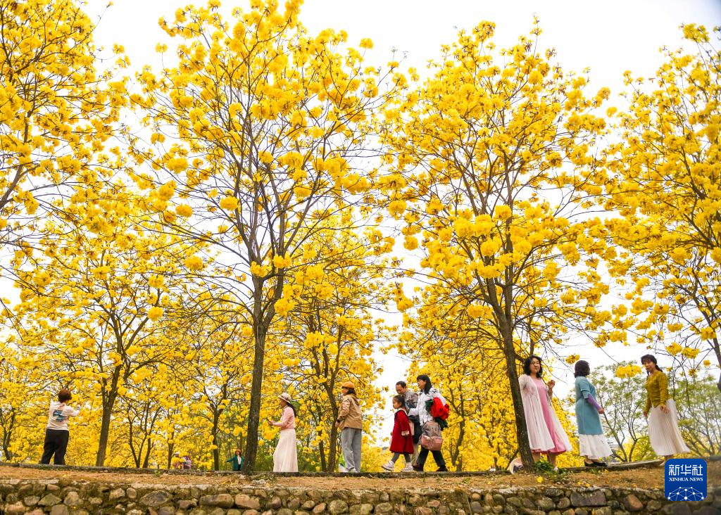 4月5日,在广西桂林市临桂区会仙镇岭上村,人们在黄花风铃木树下游玩。