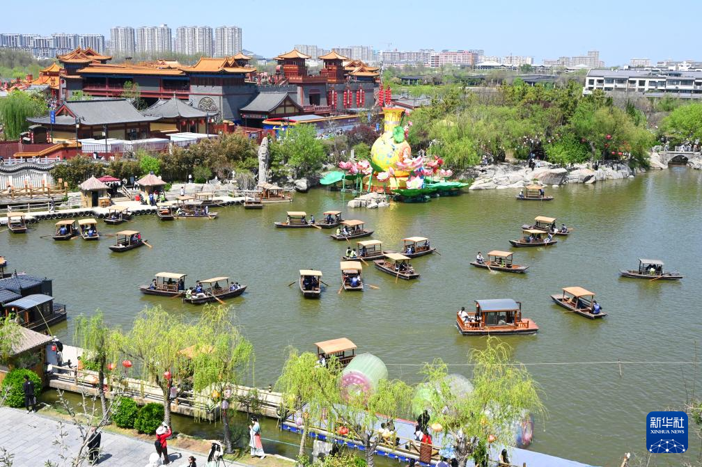 4月5日,游人坐船在河南省开封市翰园碑林游览。