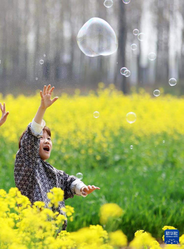 4月5日,小朋友在山东省临沂市郯城县郯城街道一处油菜花田游玩。