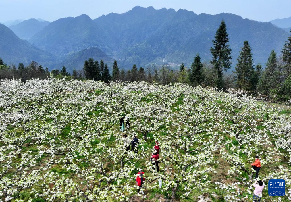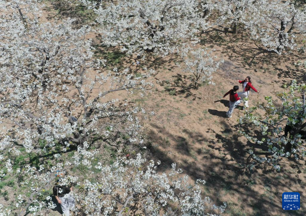 4月5日,游客在湖北省恩施土家族苗族自治州宣恩县椒园镇黄坪村的梨园间赏花游玩(无人机照片)。