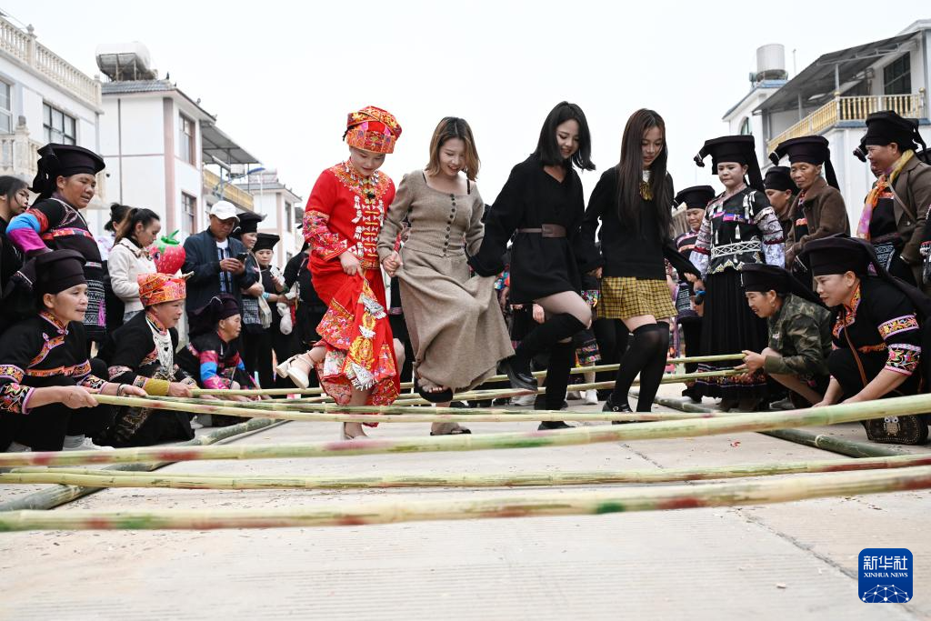 4月5日,游客在云南省文山市马塘镇十里桥村体验竹竿舞。