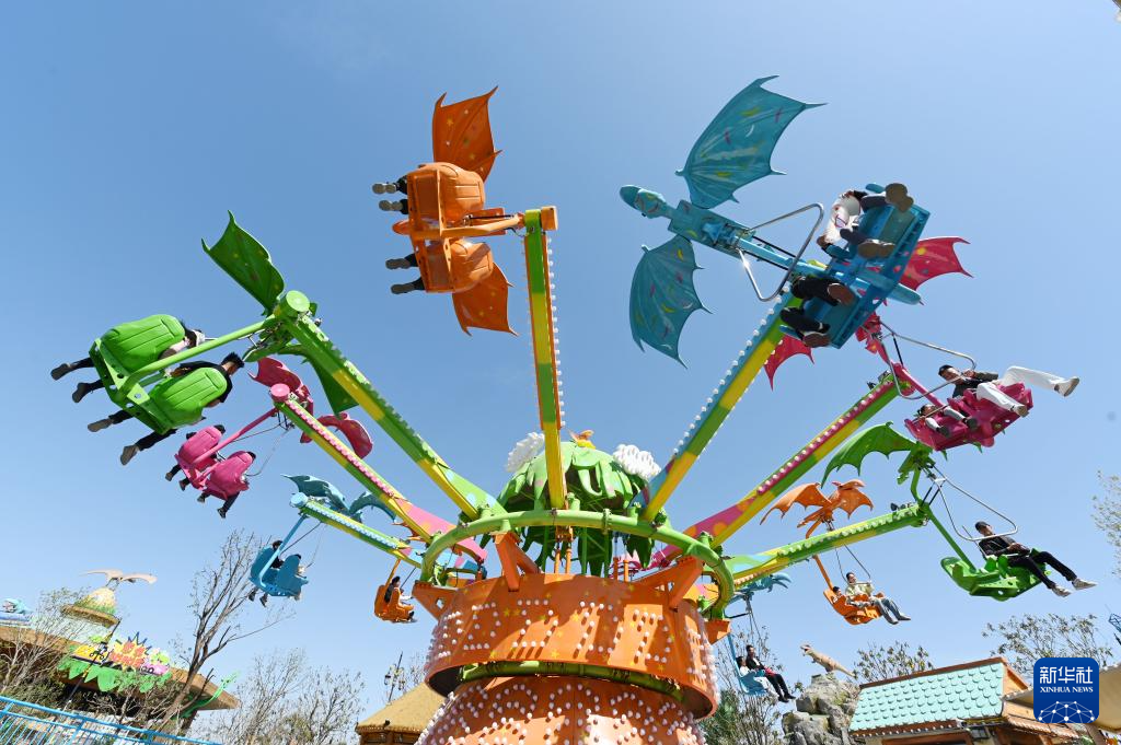 4月5日,在河南省沁阳市怀府恐龙园,游客体验“滑翔飞翼”游乐项目。