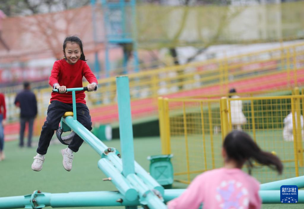 4月5日,小朋友在湖南省永州市道县一家游乐场里玩跷跷板。