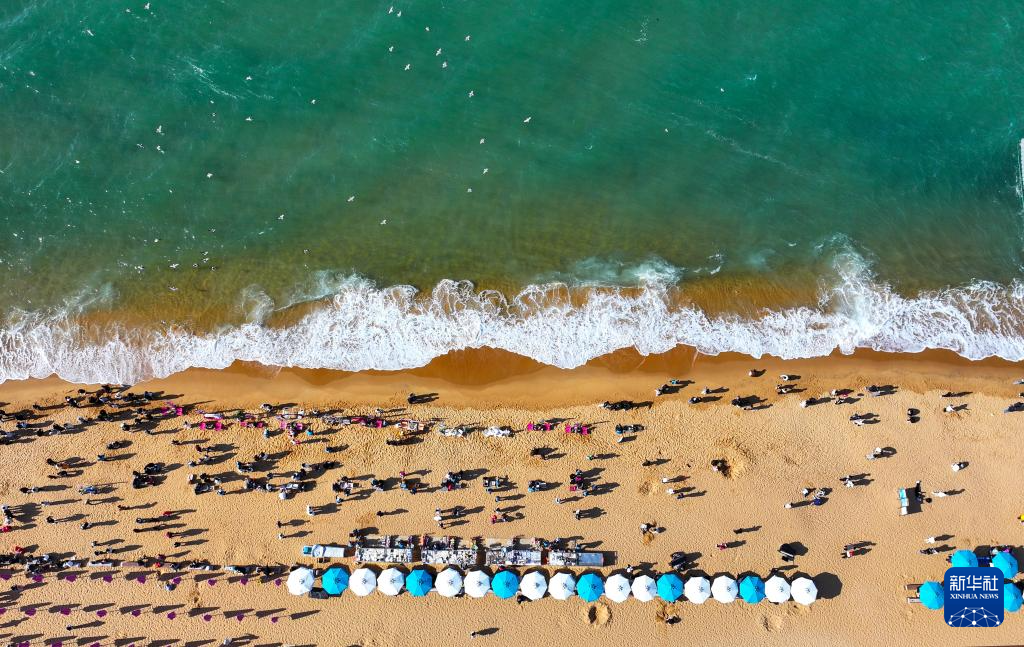 4月5日,游客在山东省威海国际海水浴场感受春日海滨风情(无人机照片)。