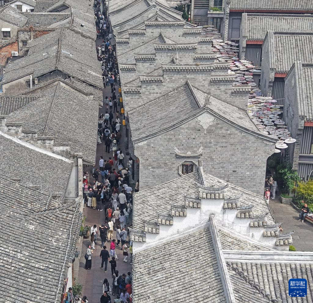 4月5日,游客在浙江省临海市紫阳古街休闲游览(无人机照片)。