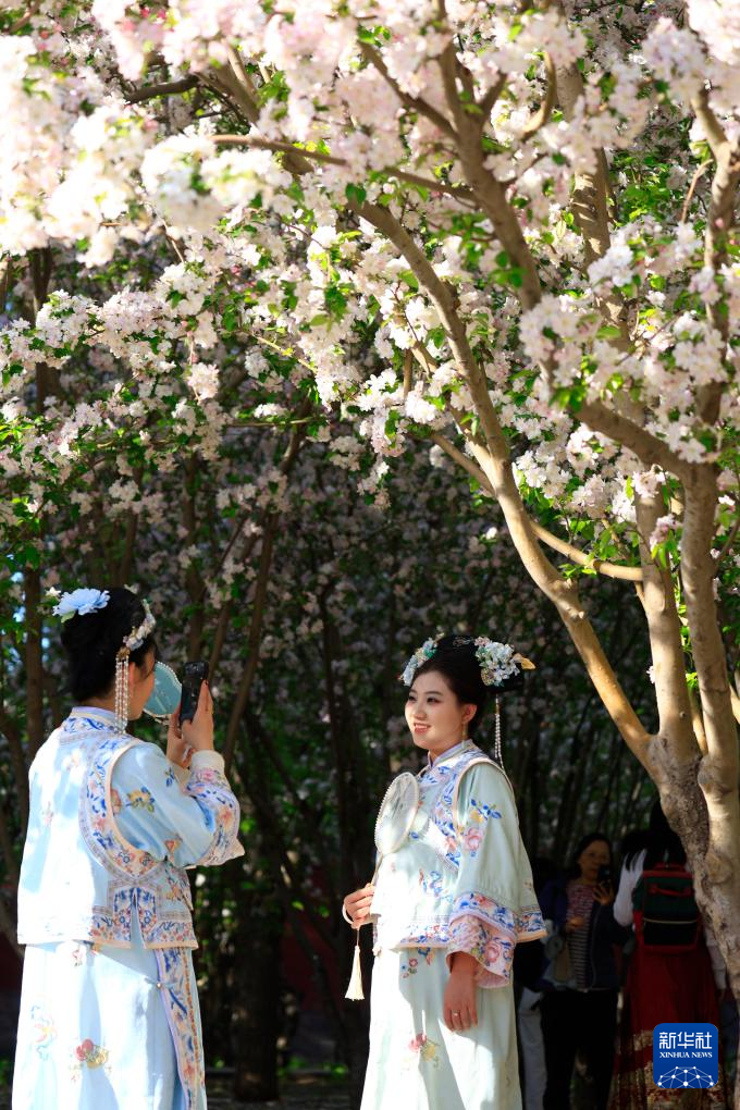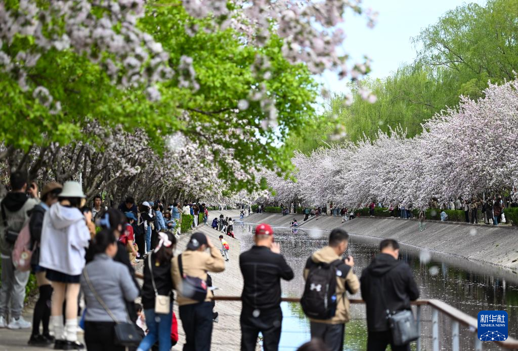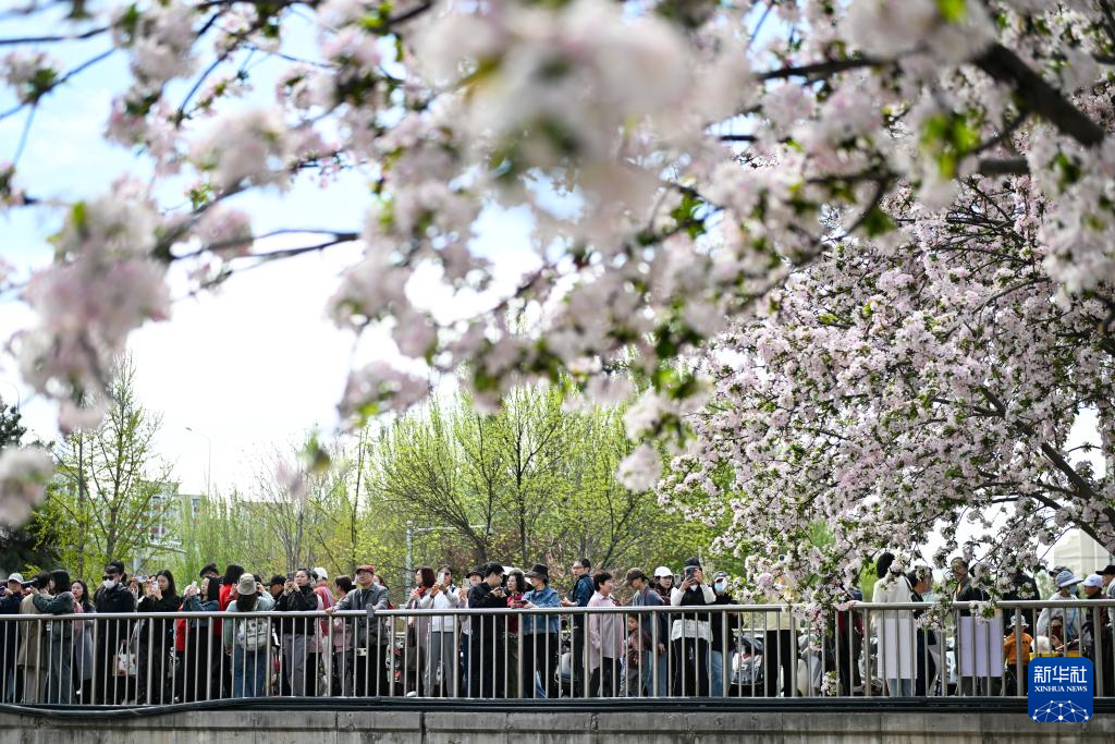 4月5日,市民在北京朝阳区望京的海棠花溪畔观赏海棠花。