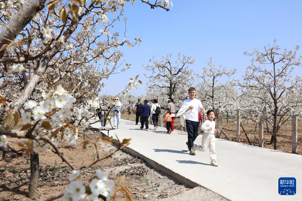 4月5日,游客在山东省滕州市柴胡店镇刘村梨园内游玩。