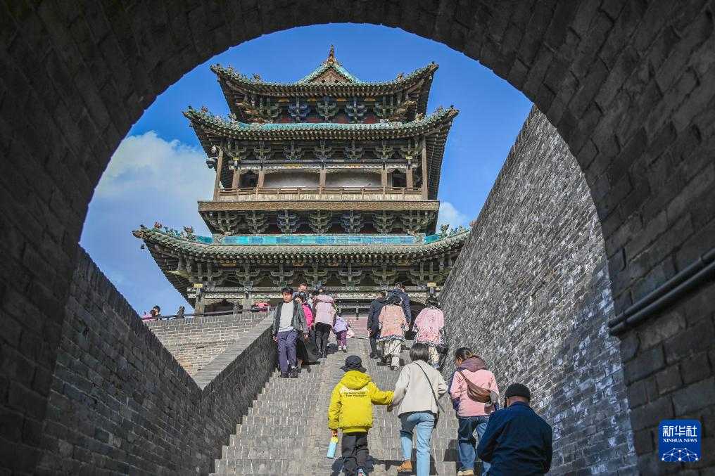 4月4日,游客登上山西省晋中市平遥古城城墙,游览观光。