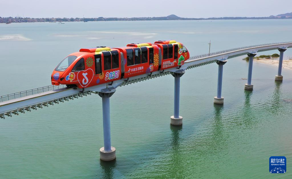 4月5日,游客在海南海洋欢乐世界度假区乘坐海上小火车(无人机照片)。