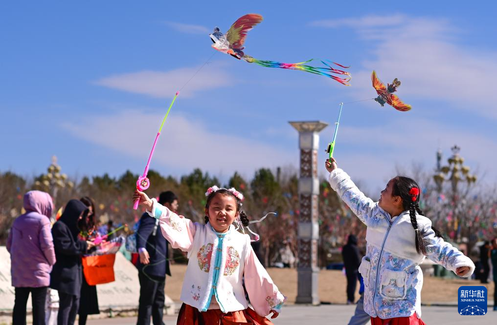 4月4日,小朋友在内蒙古鄂尔多斯市康巴什区春日文旅活动现场放风筝。