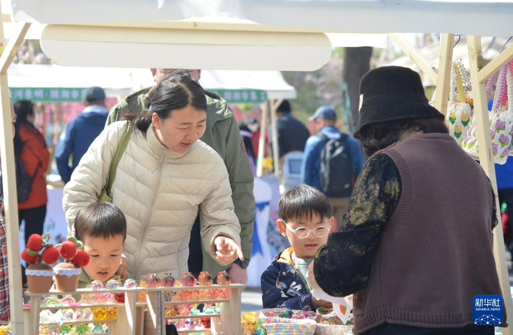 4月5日,市民在北京市海淀区清河之洲公园举办的市集上购物。