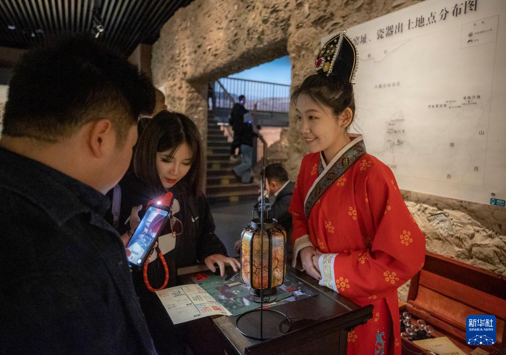 4月5日,游客在宁夏银川西夏陵博物馆内与工作人员(右)互动。