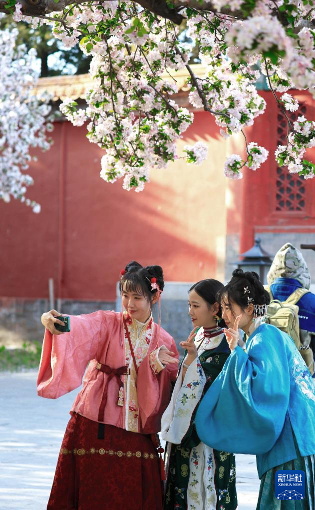 4月5日,游客在北京故宫文华殿前拍照留念。