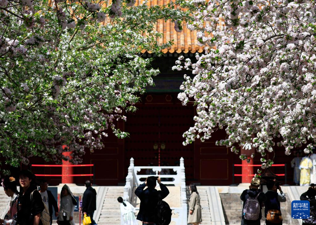 4月5日,游客在北京故宫文华殿前赏花。