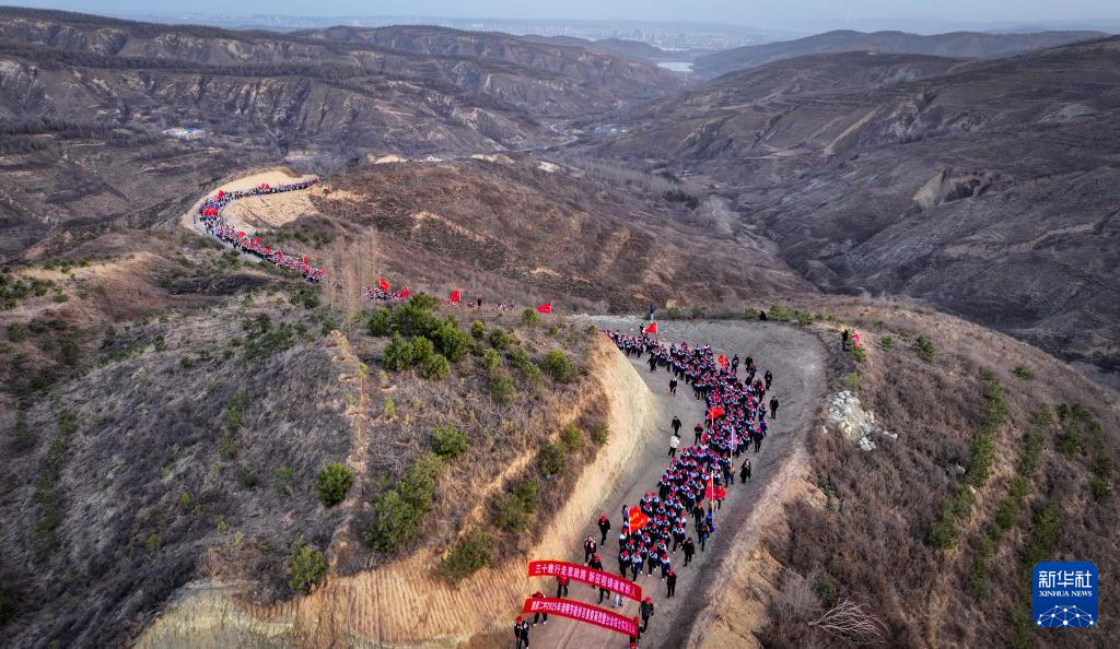 4月3日,参加徒步祭英烈活动的师生在翻越黄峁山(无人机照片)。