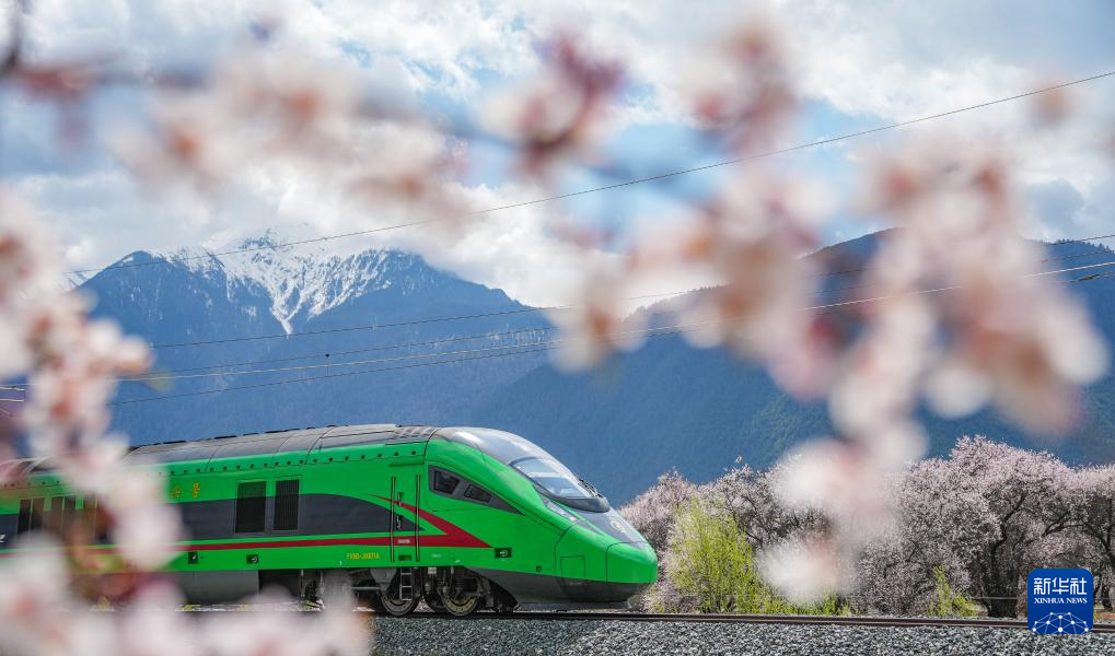 复兴号列车穿行在拉林铁路林芝段(4月2日摄)。