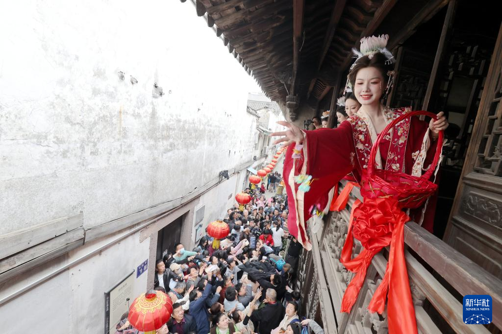 4月4日,在湖州市德清县新市古镇,“蚕花娘娘”在撒蚕花。