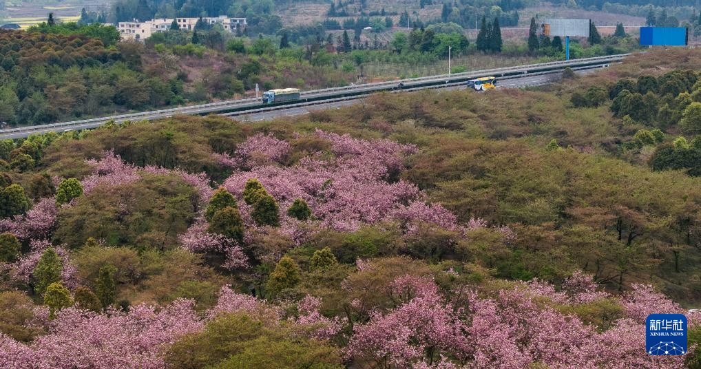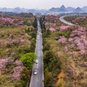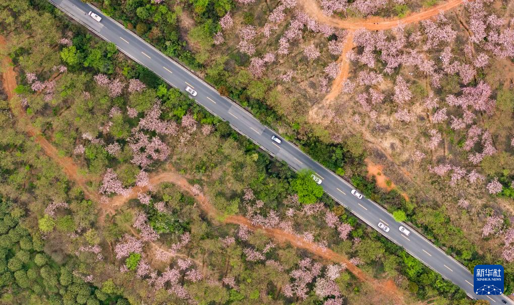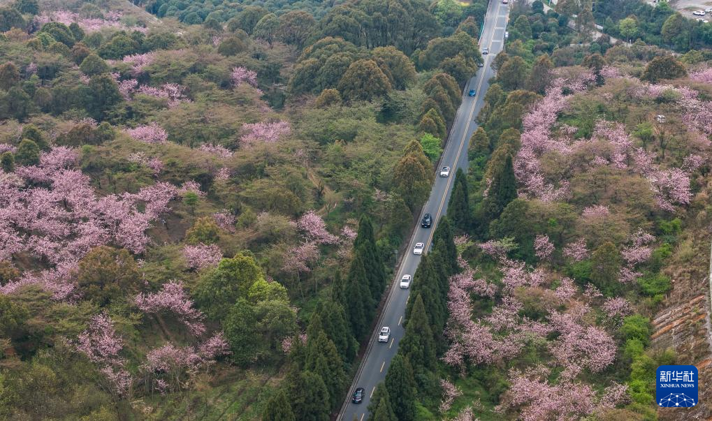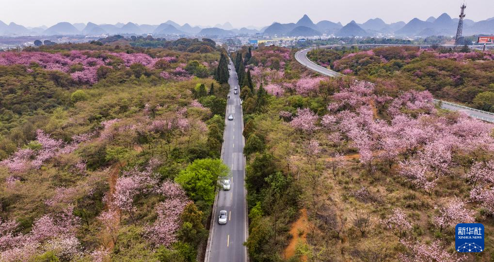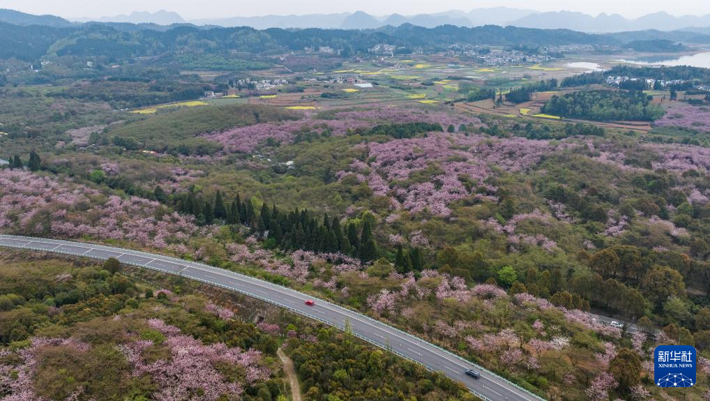 清明时节,贵州省贵阳市清镇市红枫湖镇右二村公路旁的樱花、海棠花竞相绽放,道路与花海相映,人们驱车前来踏青游玩,感受美好春光。