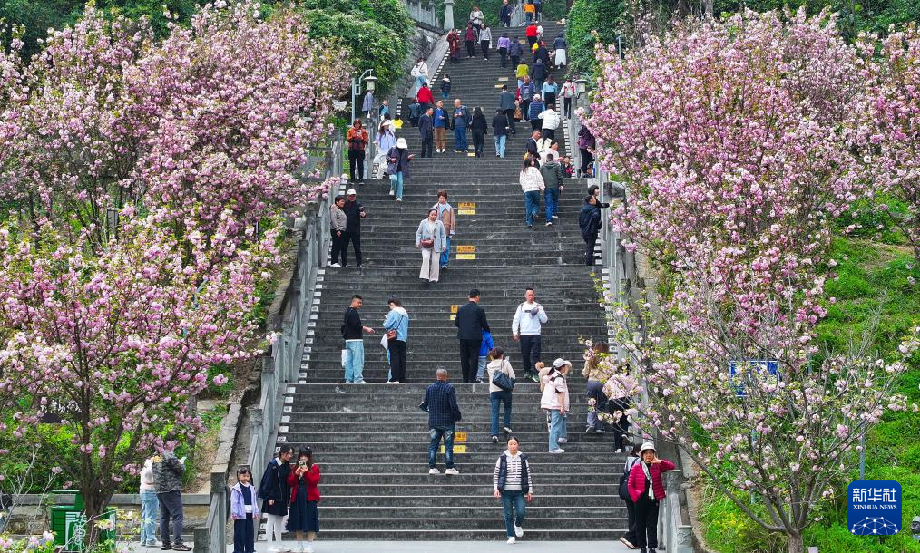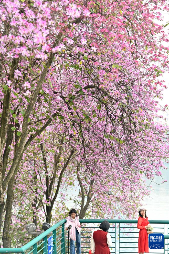 4月6日,游客在广西柳州市东堤路盛开的洋紫荆花下赏花拍照。